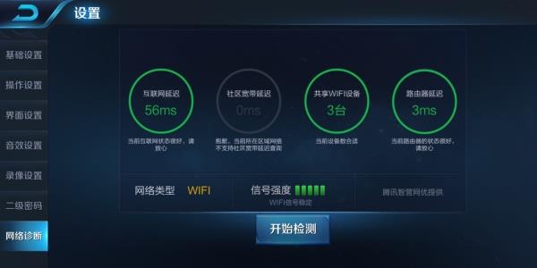 作为一款竞技类型的手机网络游戏,自然需求WiFi信号具备低延迟,而游戏内的网络诊断功能恰好可以检测路由器的WiFi信号是否给力。